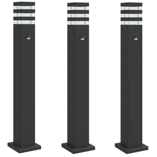 Lămpi podea exterior cu senzor, 3 buc., negru, 80 cm, aluminiu